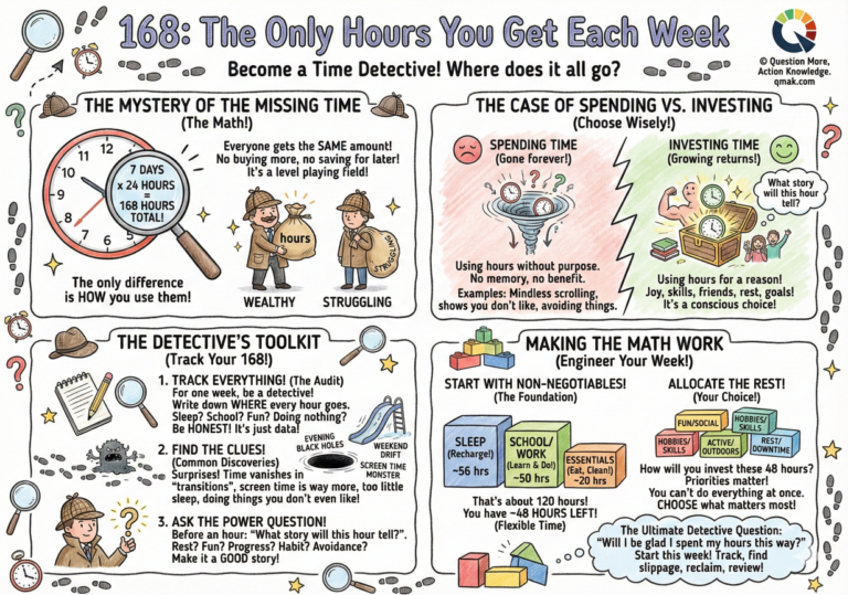 This isn’t a character flaw. It’s a skill gap. Time awareness is rarely taught, yet it’s one of the most powerful tools you can develop. “168” introduces this concept through a simple framework: becoming a time detective.