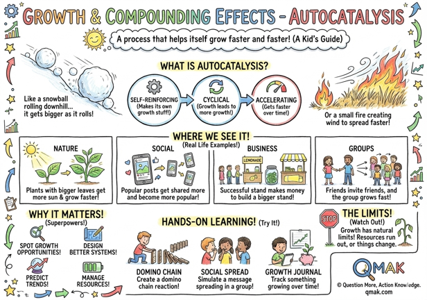 Remember, autocatalysis is a powerful force that can create rapid growth in many different kinds of systems. By understanding how it works, we can better recognize, create, and manage self-reinforcing growth cycles in our own projects and activities. However, it’s also important to remember that all growth has limits, and understanding these limits is just as important as understanding the growth itself.