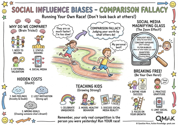 The comparison fallacy is our tendency to measure our worth, success, and happiness against others, often leading to feelings of inadequacy, envy, or disappointment. It’s like we’re all running different races but constantly looking over our shoulders to see how everyone else is doing – a habit that not only slows us down but can make us lose sight of our own path entirely.