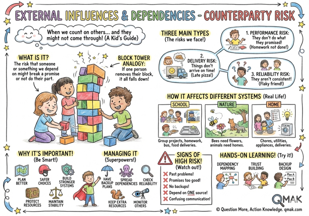 Think of something important you depend on – like getting to school, having lunch, or completing homework. Design at least two backup plans for if your usual way doesn’t work. Test your backup plans when you don’t really need them, so you know they’ll work when you do. This helps you prepare for counterparty risk and builds confidence in handling unexpected problems.