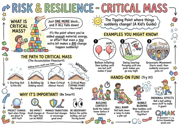 Critical mass is the point where a system (like a tower of blocks) has built up enough material, energy, or some other input that even the smallest extra bit causes a major change in its state or behavior.