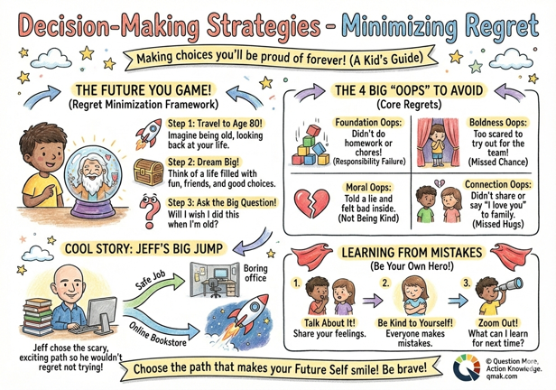 Teacher’s Note: By introducing the concept of regret minimization in an age-appropriate manner and modeling its application in our own lives, we can help children develop the skills and mindset needed to make decisions that align with their long-term happiness and success.