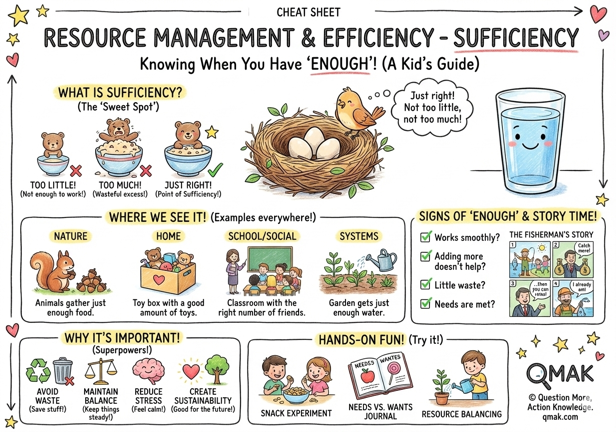 Remember, sufficiency isn’t about limitation – it’s about optimization. Like the bird building its nest or the fisherman catching just enough fish, understanding sufficiency helps us create systems that work well without waste or excess.