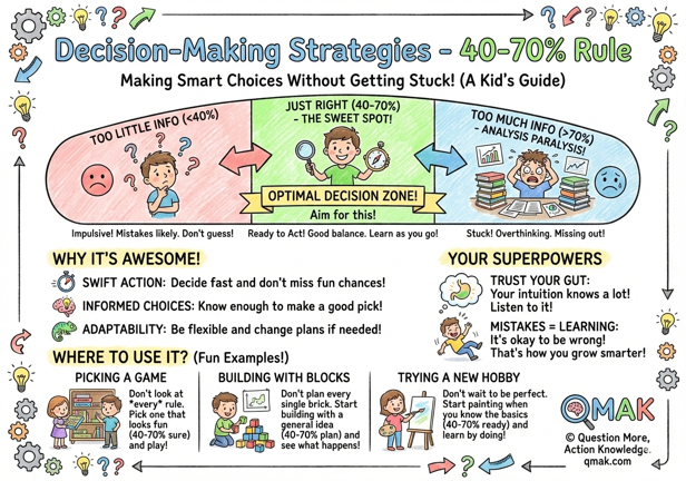 Present the 40-70% rule through examples that resonate with children’s experiences, such as choosing a game to play with friends or deciding what to build with blocks. Emphasize the importance of gathering enough information to make a good choice without getting stuck in indecision.