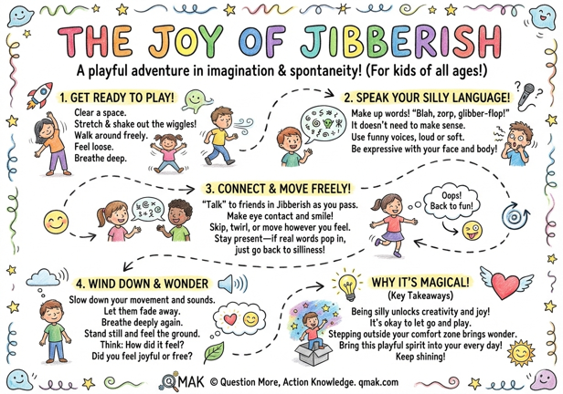 Welcome, everyone, to this delightful adventure into the world of imagination and spontaneity! In a world that can sometimes feel too serious, we're coming together today to remember the power of silliness, laughter, and letting go of our usual ways of thinking and acting. By speaking in a made-up language and moving freely through space, we'll tap into a childlike sense of wonder and creativity, breaking free from the limits of our everyday thoughts and routines.