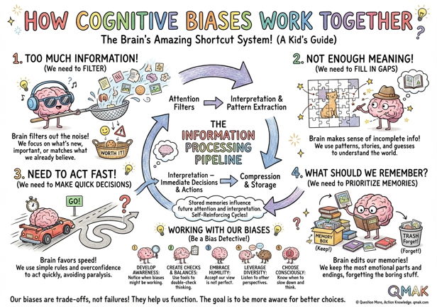 Adaptive Trade-offs: Each bias represents a trade-off between competing needs. We can’t process everything, so we filter. We can’t store everything, so we compress. We can’t wait for certainty, so we jump to conclusions. These aren’t failures but features that allow us to function. The key is recognizing when these usually-helpful shortcuts are leading us astray.