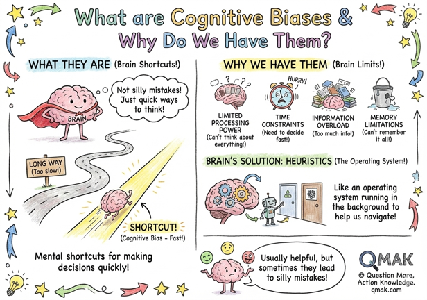 Cognitive biases are systematic patterns of deviation from rationality in judgment and decision-making. They’re not character flaws or signs of poor intelligence: they’re universal features of human cognition that evolved to help us survive. These mental shortcuts allow us to process information quickly and efficiently in a complex world where we face too much information, too little time, and limited mental resources.